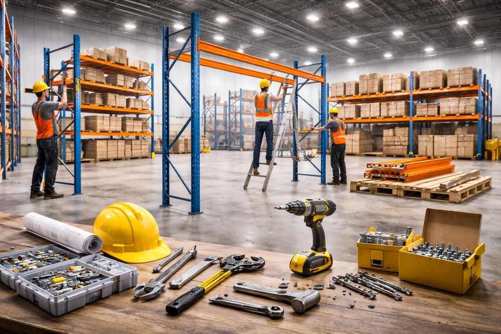 Kurulum, raf sisteminin ana taşıyıcıları olan dikmelerle başlar. Dikmeler, belirlenen yerleşim planına uygun şekilde zemine yerleştirilir.